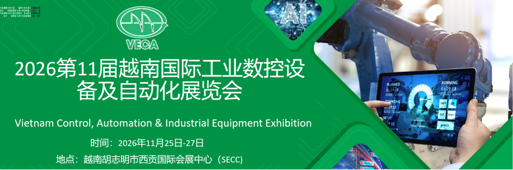 越南国际工业数控设备及从动化博览会(VECA)由越南胡志明市工贸厅及越南胡志明市从动化协会、越南机械人协会结合参取组织的专业工业从动化、机械人范畴行业专题展。每年度正在越南北部经济核心河内及南部经济核心胡志明市各举办一届,做为越南从动化行业面向国际同业交换合做的平台。上年度展会吸引来自中国、越南、韩国、印度、、中国、新加坡等国度及地域200多个从动化品牌参展推介,做为越南国度告白博览股份公司VINAMAC工业系列品牌旗下从动化专题展,同期联展无机械配备、焊接切割、金属加工及机床等专题联展,2025年胡志明市展规模1000+展位,吸引18895名专业不雅众参加买卖。展期举办的越南从动化行业国际成长论坛、越南机械人行业讲话研讨会等多场次专业勾当,吸引了浩繁越南本土从动化及机械人范畴企业及专家的到访交换合做。