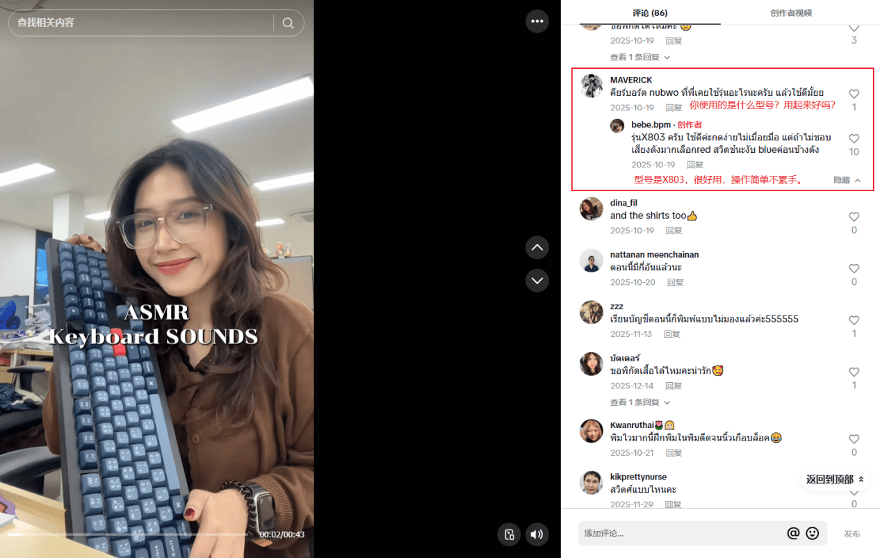 为了ASMR帮眠解压的风行趋向,触达到更多的消费者,Keychron品牌还合做了TikTok上的办公室日常分享达人bebe。bpm,通过利用Keychron的机械键盘所发出的奇特的机械轴体声音吸援用户逗留。评论区有用户自动扣问型号取体验感若何,达人的反面答复间接缩短了径,也验证了内容即告白的营销逻辑。