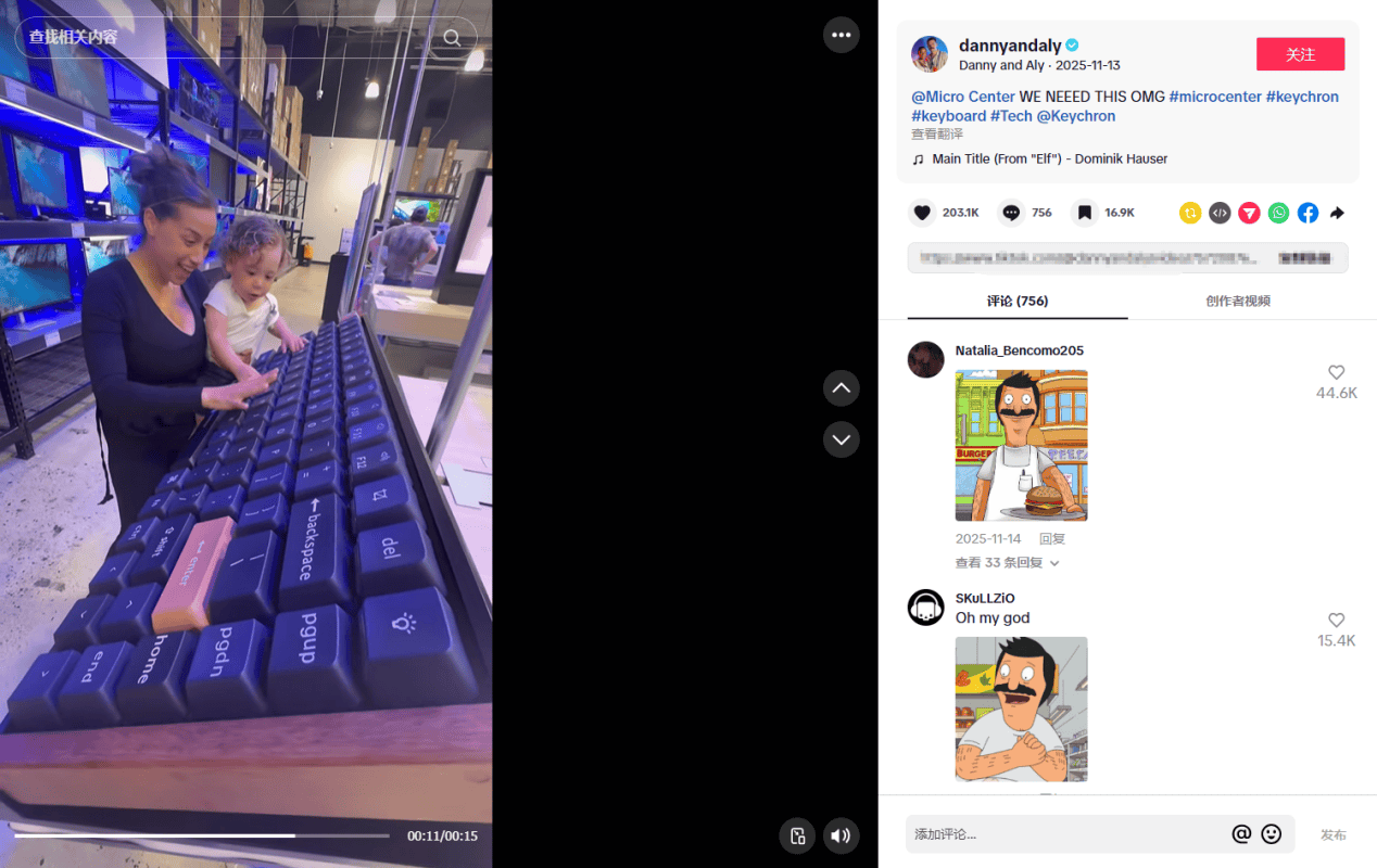 对于良多海外的消费者来说,外设属于体验型产物,正在无法亲身上手试用的环境下,他们习惯通过旁不雅他人的测评和体验来做决定。Keychron品牌也抓住了这二心理,积极结构TikTok等抢手社媒平台。操纵平台的势能,让更多的人看到产物,吸引到分歧圈层的消费者入场。正在TikTok上,Keychron品牌的达人合做策略很风趣。他们找寻了分歧范畴的达人,正在拍摄的视频上弄法各有分歧。Keychron品牌取具有100万粉丝的亲子账号dannyandaly合做发布的视频,取常规的引见、试用视频分歧。该视频以商场偶遇巨型键盘为创意切入点,通过夸张的视觉冲击和“We need this。”这种糊口化的互动案牍,