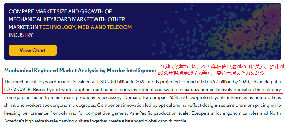 当然,产物力只是入场券,想要正在海外市场上实正坐稳脚跟,顺势而为的目光取强大的势能同样不成或缺。正在Mordor Intelligence所进行的机械键盘市场阐发中显示:全球机械键盘市场规模自2018年起比年递增,2025年估值已达到25。3亿美元,估计到2030年将增至39。7亿美元,复合年增加率为5。27%。如许强劲的增加势头,不只为行业巨头供给了增量空间,更为Keychron如许的新兴品牌创制了绝佳的突围机遇。