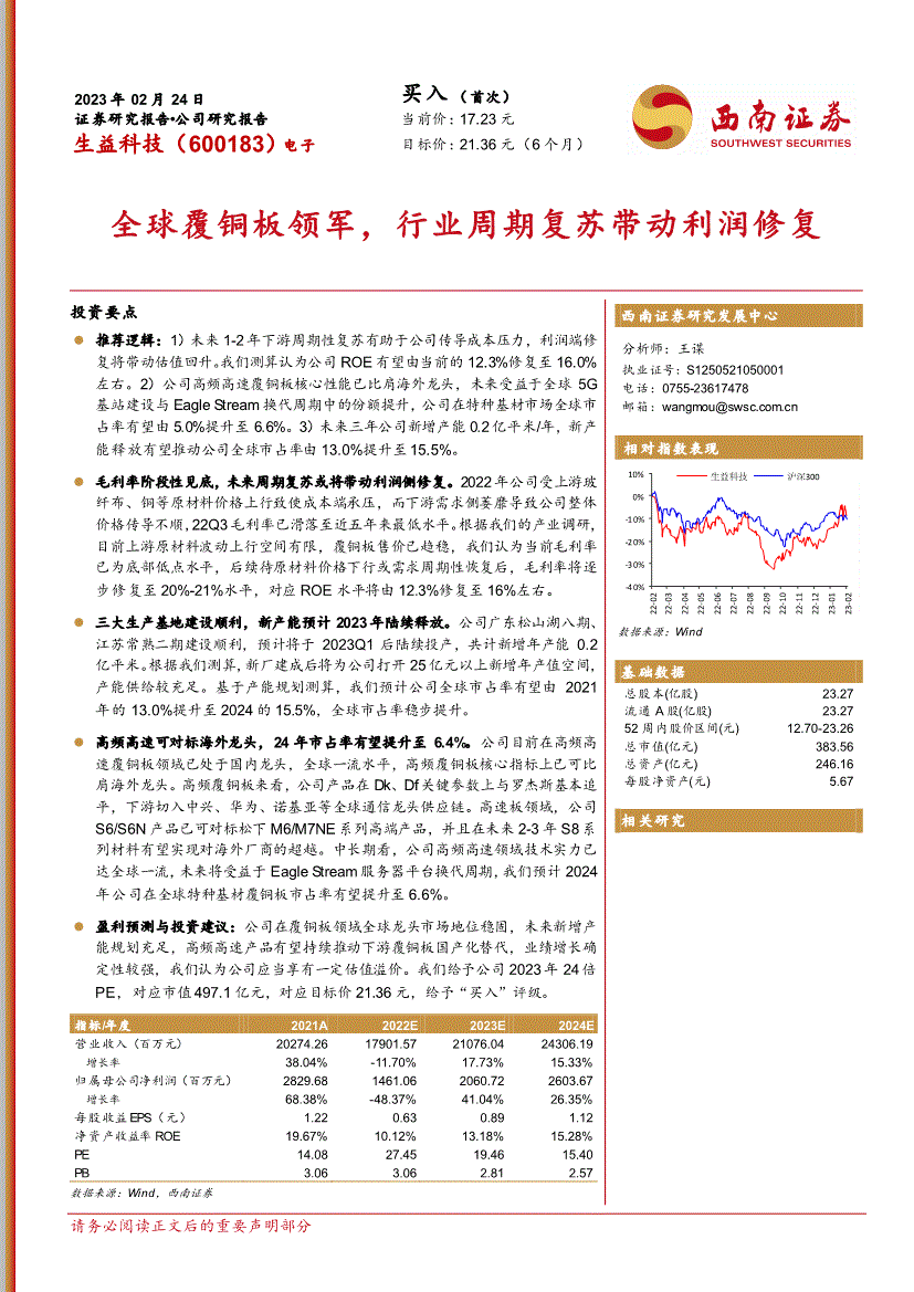 2023年02月24日 证券研究演讲公司研究演讲买入(初次) 当前价:17。23元生益科技(600183)电子 方针价:21。36元(6个月) 全球覆铜板领军,行业周期苏醒带动利润修复投资要点西南证券研究成长核心 阐发师:王谋执业证号:S01 德律风 邮箱:相对指数表示数据来历:Wind 根本数据 总股本(亿股) 23。27 畅通A股(亿股) 23。27 52周内股价区间(元) 12。70-23。26 总市值(亿元) 383。56 总资产(亿元) 246。16 每股净资产(元) 5。67 相关研究 保举逻辑:1)将来1-2年下逛周期性苏醒有帮于公司传导成本压力,利润端修复将带动估值回升。2)公司高频高速覆铜板核能已比肩海外龙头,将来受益于全球5G基坐扶植取Eagle Stream换代周期中的份额提拔,公司正在特种基材市场全球市占率无望由5。0%提拔至6。6%。3)将来三年公司新减产能0。2亿平米/年,新产能无望鞭策公司全球市占率由13。0%提拔至15。5%。2022年公司受上逛玻纤布、铜等原材料价钱上行以致成本端承压,而下逛需求侧萎靡导致公司全体价钱传导不顺,22Q3毛利率已滑落至近五年来最低程度。按照我们的财产调研,目前上逛原材料波动上行空间无限,覆铜板售价已趋稳,我们认为当前毛利率已为底部低点程度,后续待原材料价钱下行或需求周期性恢复后,毛利率将逐渐修复至20%-21%程度,对应ROE程度将由12。3%修复至16%摆布。公司广东松山湖八期、江苏常熟二期扶植成功,估计将于2023Q1后连续投产,共计新增年产能0。2亿平米。基于产能规划测算,我们估计公司全球市占率无望由2021年的13。0%提拔至2024的15。5%,全球市占率稳步提拔。公司目前正在高频高速覆铜板范畴已处于国内龙头,全球一流程度,高频覆铜板焦点目标上已可比肩海外龙头。高频覆铜板来看,公司产物正在Dk、Df环节参数上取罗杰斯根基逃平,下逛切入中兴、华为、诺基亚等全球通信龙头供应链。高速板范畴,公司S6/S6N产物已可对标松下M6/M7NE系列高端产物,而且正在将来2-3年S8系列材料无望实现对海外厂商的超越。中持久看,公司高频高速范畴手艺实力已达全球一流,将来将受益于Eagle Stream办事器平台换代周期,我们估计2024年公司正在全球特种基材覆铜板市占率无望提拔至6。6%。盈利预测取投资:公司正在覆铜板范畴全球龙头市场地位安定,将来新减产能规划充脚,高频高速产物无望持续鞭策下逛覆铜板国产化替代,业绩增加确定性较强,我们认为公司该当享有必然估值溢价。我们赐与公司2023年24倍PE,对应市值497。1亿元,对应方针价21。36元,赐与“买入”评级。假设2:印制电板营业方面,我们估计公司产能由2021年的116万平米/年提拔至2024年的201万平米/年,假设期间产能操纵率别离达到75%/79%/90%,此中2021年产物单价为3067元/平米,我们估计2022-2024年均价同比变更为-5%/+5%/+5%。我们区别于市场的概念2022年以来覆铜板行业受上逛大商品跌价取下逛需求不景气导致毛利率大幅承压,市场对于公司盈利能力趋于隆重,但我们认为当前毛利率已处于周期底部低点程度,中持久需求周期性苏醒后公司将向下逛传导原材料成本压力,利润端具备较大修复空间。估值和方针价钱公司营业结构将来次要有几大焦点看点:1)公司松山湖、常熟、陕西等地共计规划约2260万平米/年新减产能,将来产能规划充脚;2)公司近几年正在高频高速范畴产物焦点参数已逃平海外龙头产物,实现国内对海外手艺垄断的冲破,将来几年将持续受益于高端产物鄙人旅客户中的份额提拔。基于以上考虑,我们认为公司正在覆铜板范畴全球龙头市场地位安定,产物布局、资产端营运能力取盈利能力均强于同业,高频高速产物无望持续冲破海外手艺壁垒鞭策下逛PCB相关范畴国产化替代,将来业绩确定性较强。我们认为公司当前盈利能力已处于周期底部程度,将来利润率修复将带动估值回升,基于以上阐发我们认为公司较行业可比公司而言应享有必然估值溢价,我们赐与公司2023年24倍PE,对应市值497。1亿元,对应方针价21。36元,赐与“买入”评级。公司次要处置覆铜板、粘结片和印制电板的设想、出产取发卖,目前可实现自从出产覆铜板、半固化片、绝缘层压板、金属基覆铜箔板、涂树脂铜箔、笼盖膜类等高端电子材料。公司产物鄙人逛次要被用于制做单、双面线板及高多层线G 天线、通信基坐、大型计较机、高端办事器、航空航天工业、芯片封拆、汽车电子、智能家居、工控医疗设备、家电、消费类终端等范畴。公司手艺堆集深挚,运营办理劣势较着,率先外行业内通过ISO9001、ISO14001、ISO/TS16949和BS7799消息平安等办理系统认证。凭仗多年取下旅客户的深度合做,公司的次要产物已获得博世、联想、索尼、飞利浦等国际、国内出名企业的认证,产物合作劣势较着,正在美洲、欧洲、韩国、日本、东南亚等世界多个国度和地域取得了普遍发卖。公司股权布局较为分离,目前暂无绝对控股股东,背后第一大股东广新控股集团和第二大股东东莞市国弘投资别离附属于广东省国资委、东莞市国资委,2022Q3合计持续占比达38。46%。西南证券拾掇1。2公司业绩:业绩全体稳步向上,本年受外部要素扰动短期承压1。2。1成长能力:营收稳步成长,利润端逐年公司的从停业务次要包罗:覆铜板和粘结片、印制线电板两块构成:从营收布局来看,2022H1公司覆铜板和粘结片营业实现停业收入72。8亿元,同比下降8。3%,占停业收入比沉达81%;印制线电板营业实现停业收入17。